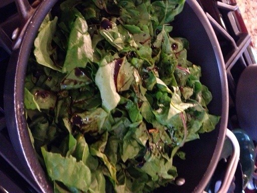 Then, heat up a little oil and some garlic. Garlic makes everything better (except kissing). As soon as your garlic starts to brown, and it only takes a minute, throw in your chard and add your balsamic vinegar. Let it cook, stirring often. I prefer to use tongs for this. Now, don’t be alarmed, but it will deflate…a lot. A whole lot. The first time I made this was to bring to someone’s house as a side dish. I was so embarrassed showing up with a tiny container for a group to split. It didn’t matter though