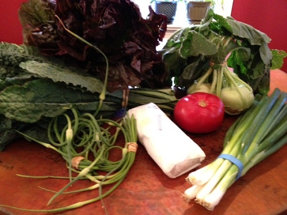 Here is Week 2 of my CSA share in all it’s glory, minus the beets because I gave those away this week. Sorry, I needed a beet break. I received another bunch of Red Leaf Lettuce, which I am more than halfway through thanks to my salad loving days and ways, another beautiful Beefsteak Tomato, which made its way into Sunday’s Caprese Salad, Kale, which has popped up in my morning smoothies (only once thus far, but I will go back), Kohlrabi, more Green Onions (I literally just finished the batch I got in week 1), Garlic Scapes (ooooh, so excited for these) and another pound of meat. Where’s the beef! The Hubby and family actually put a pretty good dent in the meat on Sunday, and the rest is chilling in the freezer. The Kohlrabi and the Green Onions are part of tonight’s dinner, since I think I might be up for some actual cooking again.