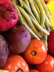We got a little bit of everything this week: beets (rhymes and rhythms), bell peppers, patty pan squash, summer squash, hot hungarian peppers (dance ladies, dance), red and yellow onions, green beans, beefsteak tomatoes, green leaf lettuce, and a voluptuous eggplant, which as of this moment is still sitting in my fridge and looking a lot less voluptuous. I’m hoping to cook her up today and share her in my next CSA post. See, now you have to come back to see how it ends for our sexy purple lady.