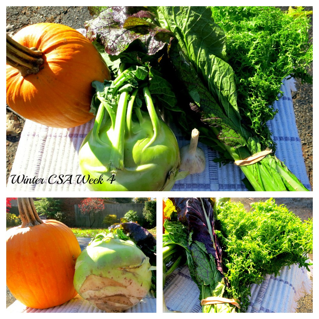 Week four of the Winter CSA brought me some garlic (no surprise there), a Kohlrabi, some odd greens perhaps mustard greens, a moss like substance (any ideas? Bueller?), and drum roll please….a pumpkin pie pumpkin. When I grabbed my half of the share, my first thought was, “You gotta be fucking kidding me,” (If you think what I say out loud is bad, you should hear the foul words running through my mind.) followed closely by, “A pumpkin. Another damn pumpkin.”